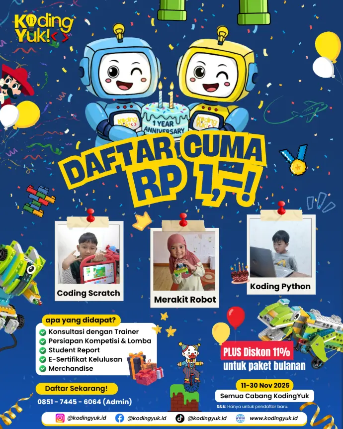 KodingYuk adalah tempat kursus coding dan robotik yang dirancang khusus untuk anak-anak. Dengan materi yang disesuaikan usia dan kemampuan, anak-anak akan belajar mulai dari membuat game sederhana hingga mengenal bahasa pemrograman seperti Python untuk menciptakan program. Di KodingYuk, pembelajaran dilakukan dengan pendekatan yang menyenangkan, sehingga anak-anak bisa menikmati proses belajar sekaligus mengasah kreativitas dan keterampilan teknologi mereka.